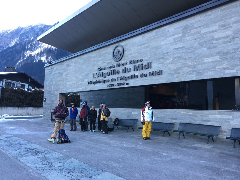 約好我們的滑雪嚮導,早上九點在山腳的纜車站碰面。 從這將啟程前往海拔3842公尺高的南針峰(Aiguille du Midi)觀景台。垂直落差超過2800公尺(9100英尺)