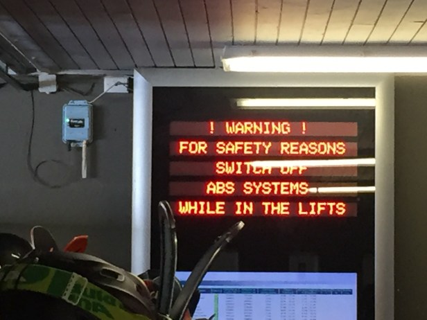 經過接二連三的吊椅纜車,最後這段的纜車可以到達最高峰 Cresta d’Arp。排隊的時候,顯示版警告要把背包的雪崩安全氣囊(ABS)開關關掉以免在乘車時意外爆開。 可是…我們的自由行背包並沒有氣囊設備。 纜車很小,上纜車上的人則是不到十來個,而且個個野雪裝備齊全:登山繩,線束,冰斧頭,ABS背包, AT雪鞋固定器。。。。我倆這自由行裝備是有這麼點不夠看。。。開始忐忑不安💧