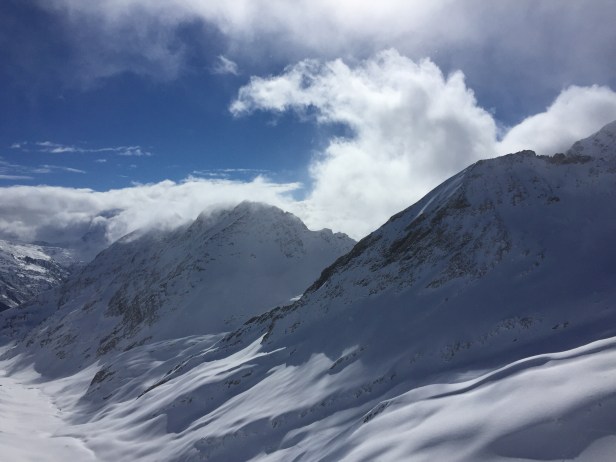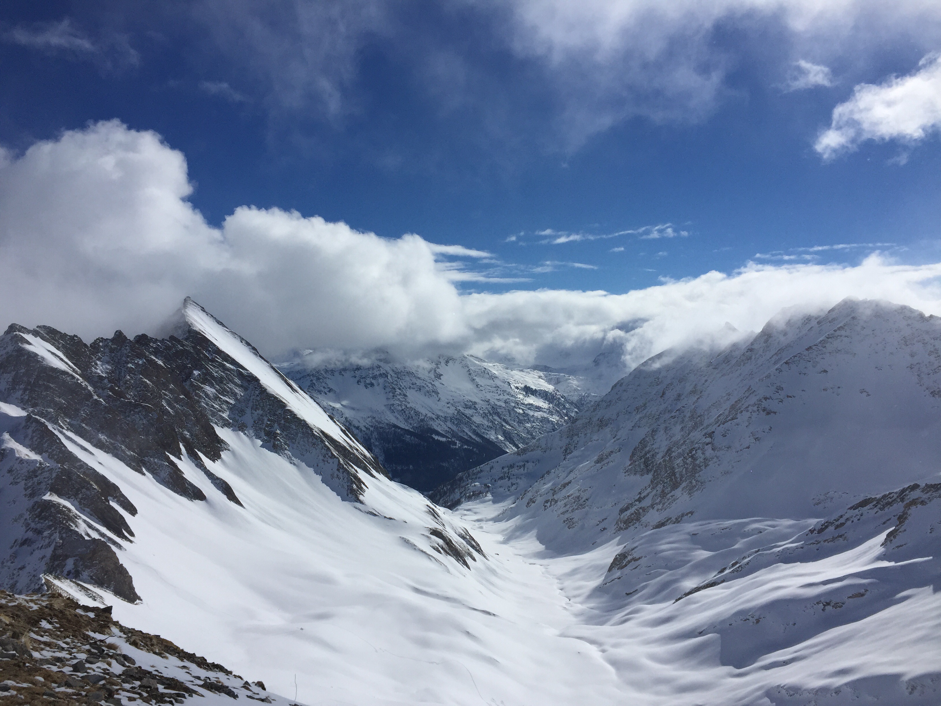 後山下去的話絕對是粉雪,可以說是致命的吸引力。遠遠望去還可以看到兩三個小如螞蟻徒步上山的高山滑遊 (alpine touring) 雪客。前山就是下面照片左邊岩石懸崖峭壁的左下方,看起來情況不單純。站在山頂是看不到如何滑下去還是走下去的。由於這回沒有請滑雪嚮導, 所以就問了纜車管理員怎麼下去然後怎麼回到前山,他用那義大利腔的英文一副不屑的回 “You need to know your way down”(你得自己知道路下去), 顯然不想負責。加上也沒看到雪道路牌指示如何從後山滑到前山, 我倆商量了一下,鑑於也老大不小,就算沒出事,萬一滑錯路,懶人野雪變成了純野雪,在這三不管地帶,枉走幾公里的上坡軟粉雪也不是開玩笑。所以就看了風景,拍了照,然後乖乖地搭纜車下去回前山吧。。。。🐓🐓