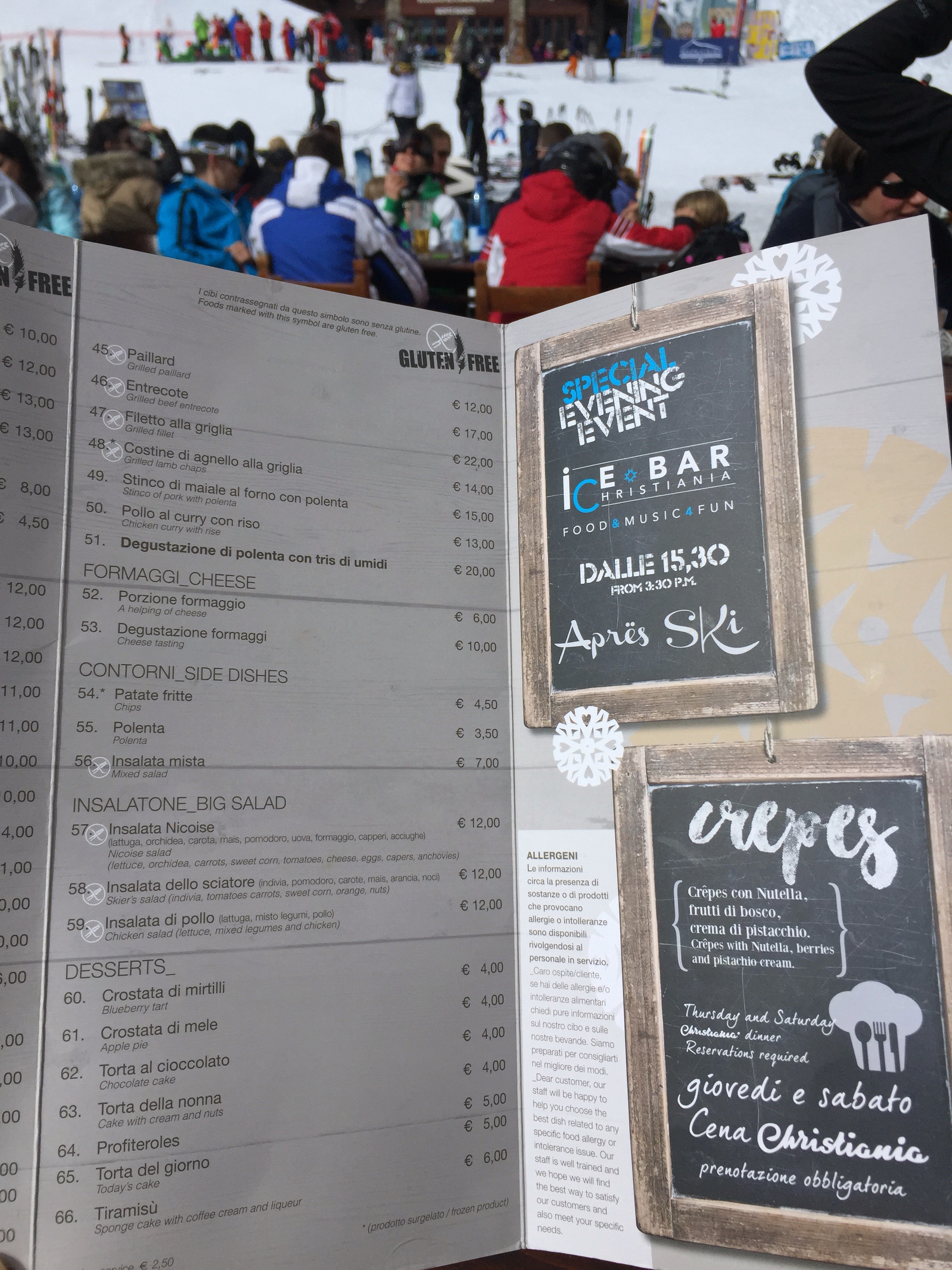 義大利滑雪場的菜單選擇還真不少,開胃菜(Antipasto), 前主菜 (Primi),後主菜 (Secondi),沙拉,起司,甜點,連無麩質蛋白 (gluten free)都有,完全不輸市區裡的餐廳,而且價位還滿合理的 (以加州滑雪場和硅谷的標準)。近年來歐元貶值的厲害,看著價目表,我們就當拿美元加小費來消費也是還可以接受的。