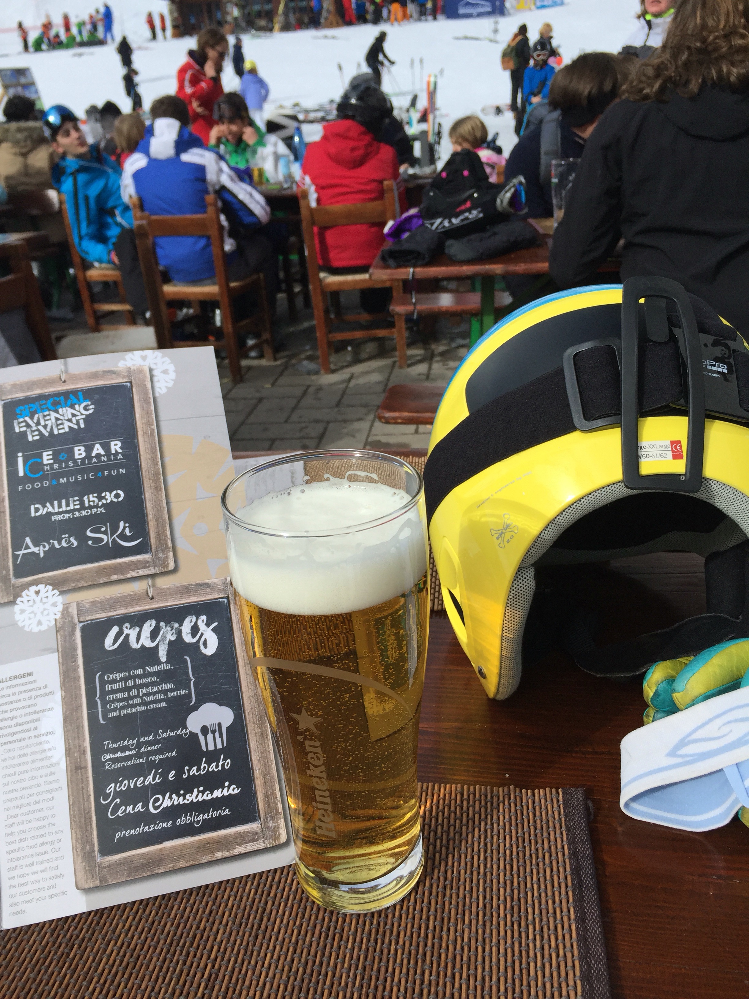 滑了幾趟前山雪道,該是吃中飯的時候。纜車基地周圍的餐廳琳琅滿目,找了一家看起來還不錯的,先坐下叫杯啤酒來輕鬆一下。