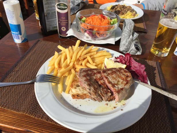 謝謝老天!讓我滑雪不再吃漢堡。這還是第一次在雪場餐廳吃菲力牛排當中飯。