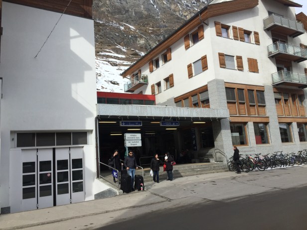 到了策馬特車站,地下室有硬幣投款出租鎖箱可以把雪具雪鞋袋寄放, 然後到對街搭免費公車再帶我倆上到山腳下的纜車站。